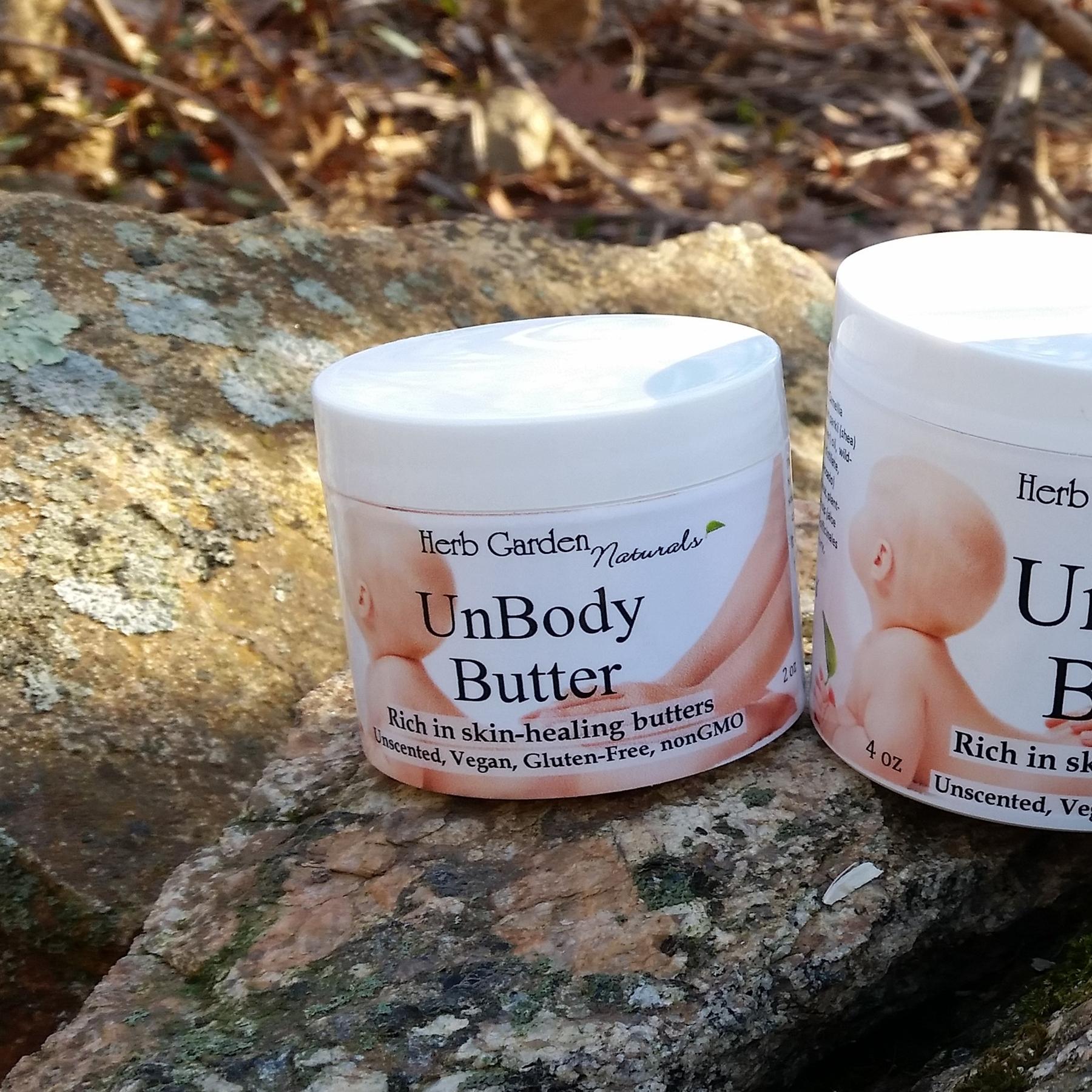Apply liberally after a day in the summer sun. In the winter, beat the drying heat of the indoors and keep your skin fresh and soft with Unbody Butter. Excellent for reducing the effects of rosacea, psoriasis, itchiness that seems to have no noticeable source and other redness. Take care of rashy baby bottoms (and adult bottoms!) without the petroleum-based ingredients in commercial products.